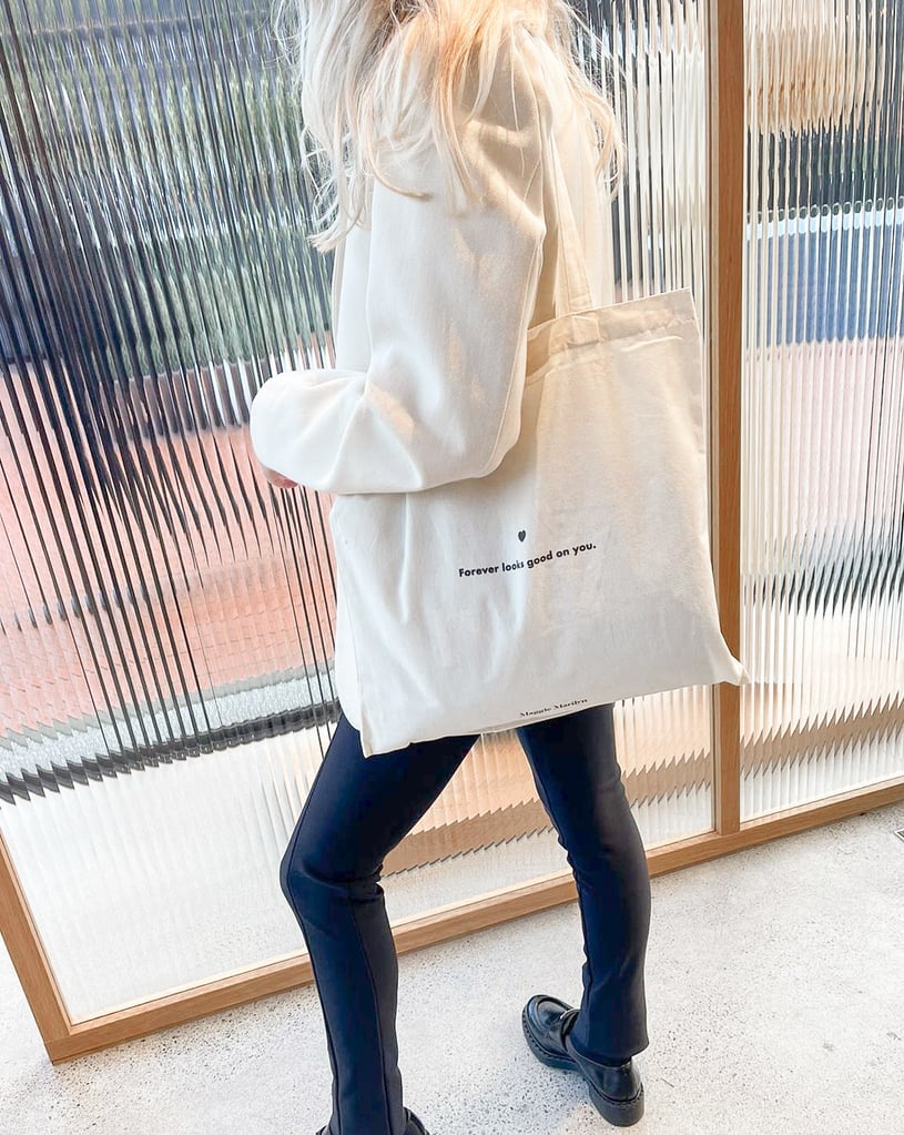 Maggie Marilyn also created custom tote bags for their Auckland store and showroom that embody the brand’s circular values. Made from Global Organic Textile Standard (GOTS) cotton, the bags can be kept long-term and re-used by customers in their day-to-day lives. The back of the bag instructs them on all the different ways the bag can be used, such as for grocery shopping or as a beach bag.
