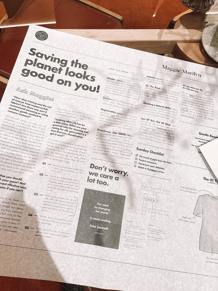 As part of the collaboration, noissue’s custom tissue paper was used to create a branded newsletter that goes out with every Maggie Marilyn online and in-store order.The newsletter features care practices for Maggie Marilyn clothes, a crossword and other eco-friendly living tips.