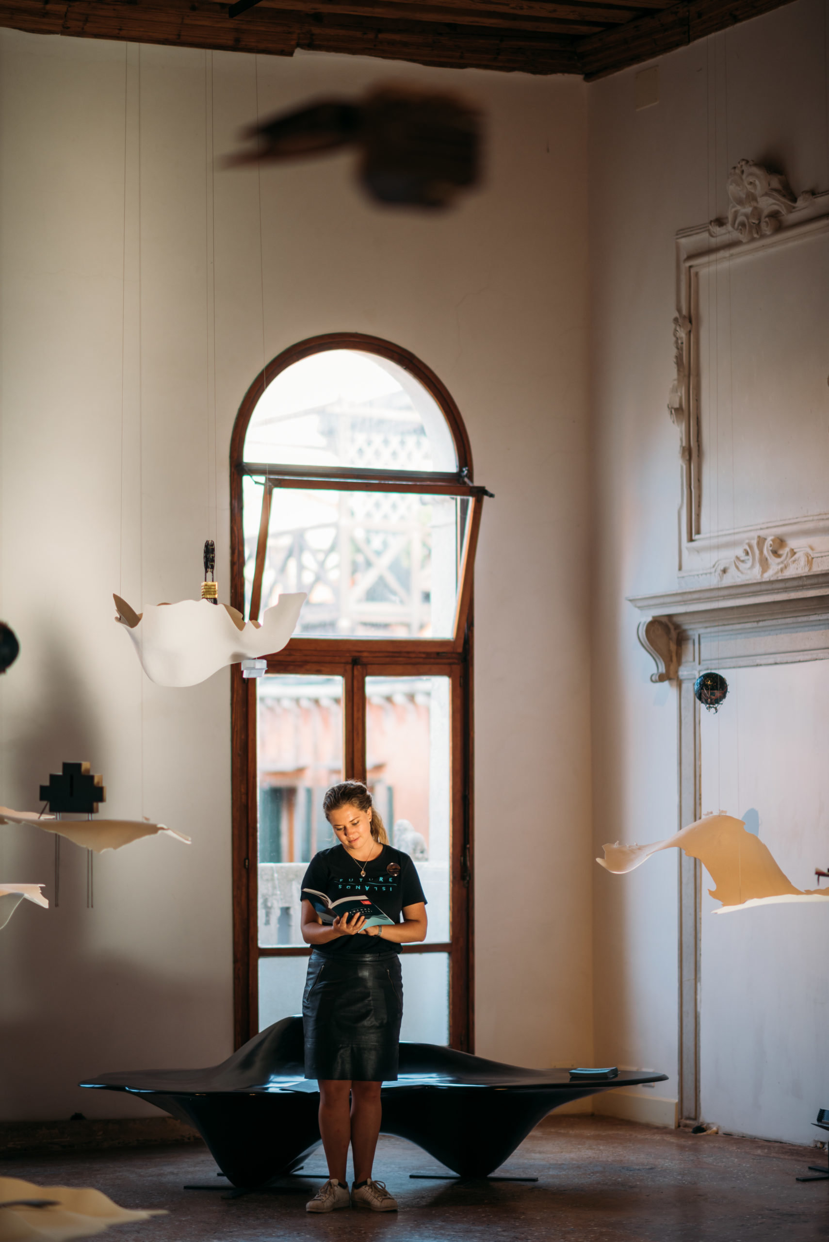 Like an America’s Cup yacht, a ‘future island’ is lightweight, strong and easily transportable. The islands have cores of either honeycomb foam, milled with a CNC router, or Polyethylene terephthalate (PET), which is then covered with a fibreglass skin and finished with Resene paint. The thinner islands are made of infused hemp, while a large black island covered with a carbon-fibre skin recycled from a Boeing 787 for added strength, doubles as exhibition seating.